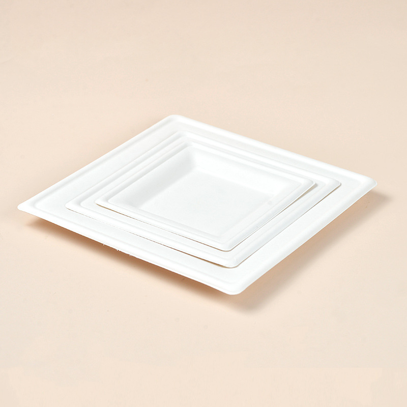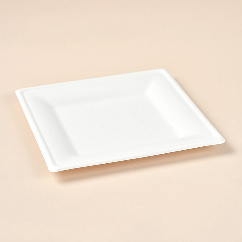 This 8-inch white square bagasse paper plate features a refined, porcelain-like texture and is perfect for serving fruit, cakes, and desserts. It's biodegradable, durable, and eco-friendly, and available at a competitive wholesale price. A must-have for any kitchen party.