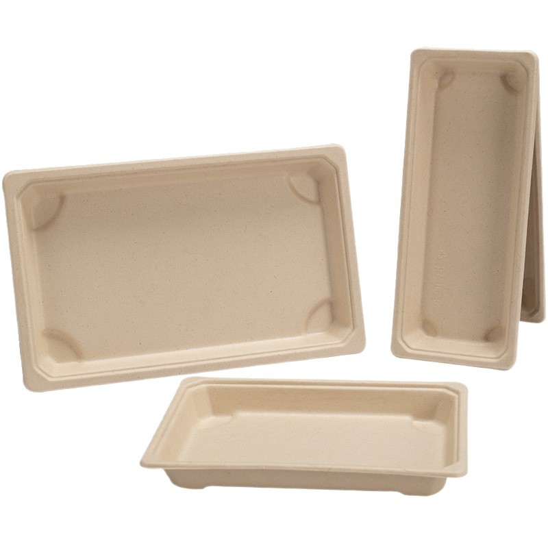 This commercial Japanese sushi tray is made from biodegradable bagasse pulp, which is pollution-free. Its rectangular size is both portable and convenient, making it a hassle-free and environmentally friendly way to pack for takeout.